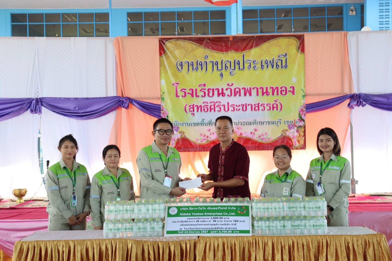 วันที่ 14 มิถุนายน 2567 บริษัทฮีดากา โยโก เอ็นเตอร์ไพรส์ จำกัด สาขาพานทอง โดยรองผู้จัดการโรงงาน และตัวแทนพนักงาน เข้ามอบน้ำดื่มฮีดากาฯ 240 ขวด และมอบเงินสนับสนุนรวม มูลค่า 3,760 บาท ในกิจกรรมงานทำบุญประเพณีของโรงเรียนวัดพานทอง(สุทธิศิริประชาสรรค์) ต.พานทอง อ.พานทอง จ.ชลบุรี